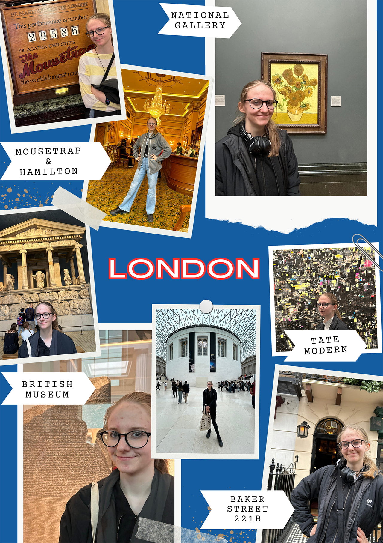 Z przyjemnością informuję, że zwyciężczynią konkursu „Majówka z angielskim” została Natalia Kawalec z grupy Creative Cranes, która utworzyła wspaniały kolaż ze zdjęć dołączając do niego taki opis: korzystając z okazji, że na lekcjach miałyśmy tematy związane z muzeami udałam się właśnie do nich. Odwiedziłam National Gallery [zahaczając oczywiście o słoneczniki Van Gogha], British Museum, Tate Modern oraz Tate British. Nie byłabym sobą gdybym nie zahaczyła też o Baker Street 221B. Podjęłam też wyzwanie i udałam się na trzy przedstawienia; The Mousetrap [na podstawie powieści Agathy Christie], Michael Jackson The musical i oczywiście Hamilton. Więcej z chęcią opowiem na najbliższej lekcji.